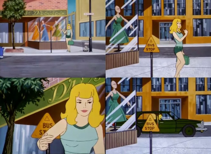 As it is, the show is basically a how-to, step-by-step instructional video for hitchhiking. Hey, kids, see what this sexy blonde lady is doing? Don't do it. Maybe this episode inspired a whole generation of kids to head downtown, park themselves on street corners, stick their thumbs out, and take the first ride they get from strange men in pea-green Buicks. If so, their blood is on your hands, Hanna Barbera.