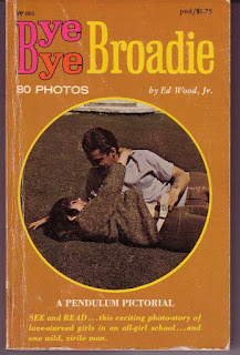 In the Ed-scripted film Orgy of the Dead (1965), William Bates plays a writer named Bob who specializes in horror stories. When his girlfriend, Shirley (Pat Barringer) reminds him that "there are so many wonderful things to write about," Bob claims that he's "tried them all -- plays, love stories, Westerns, dog stories..." That was Ed Wood for sure. He'd try anything, as Blood Splatters Quickly and Angora Fever readily attest.