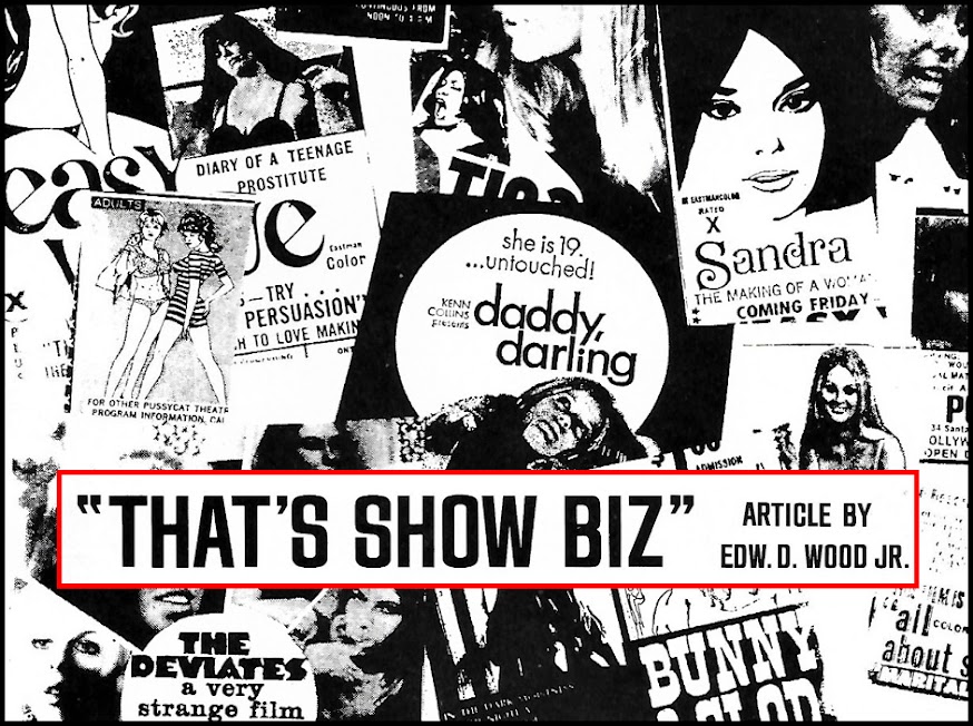Another interesting aspect of this article is that Ed Wood speculates about the future of home entertainment, well before the home video revolution of the 1980s. As we know, the pornographic loops Eddie made in the 1970s were intended for home use rather than theatrical exhibition, so perhaps that got him thinking about the issue. Obviously, watching an X-rated movie in one's own living room, basement, or rec room provides a degree of privacy that no theater could match. In "That's Show Biz," Ed points out some other advantages to watching movies at home rather than in a theater: